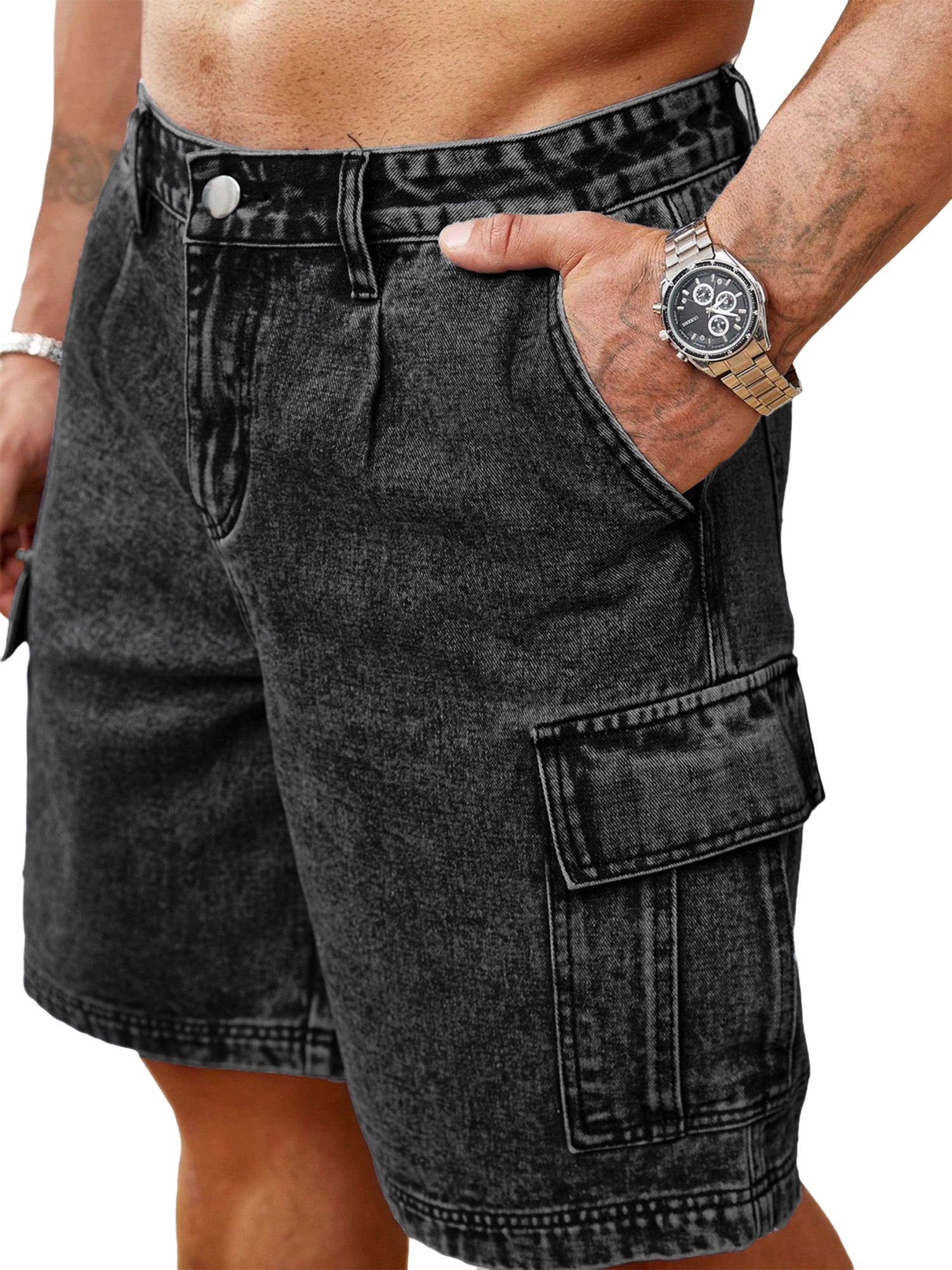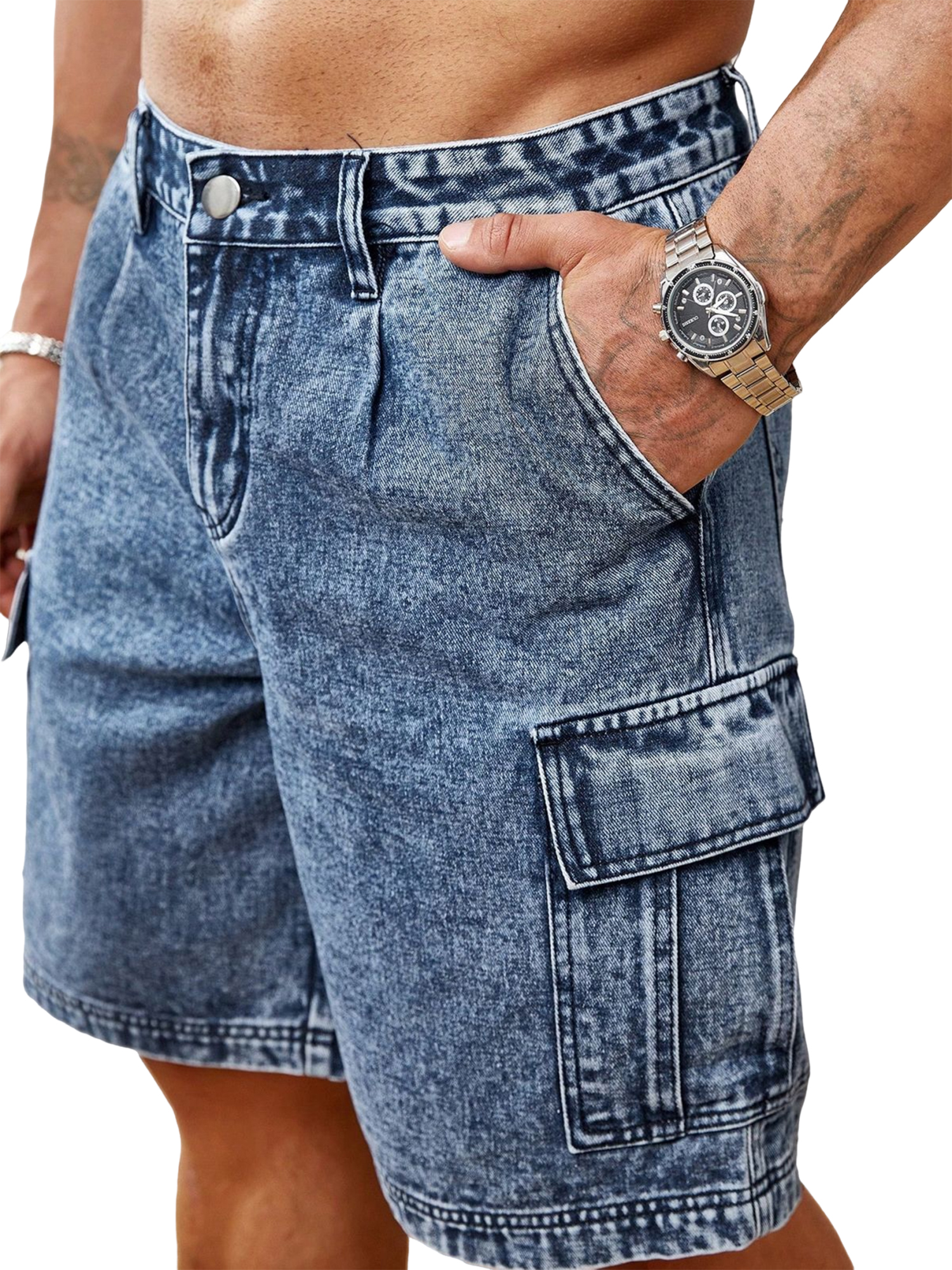 Retro-style Faux Denim Multi-pocket Shorts